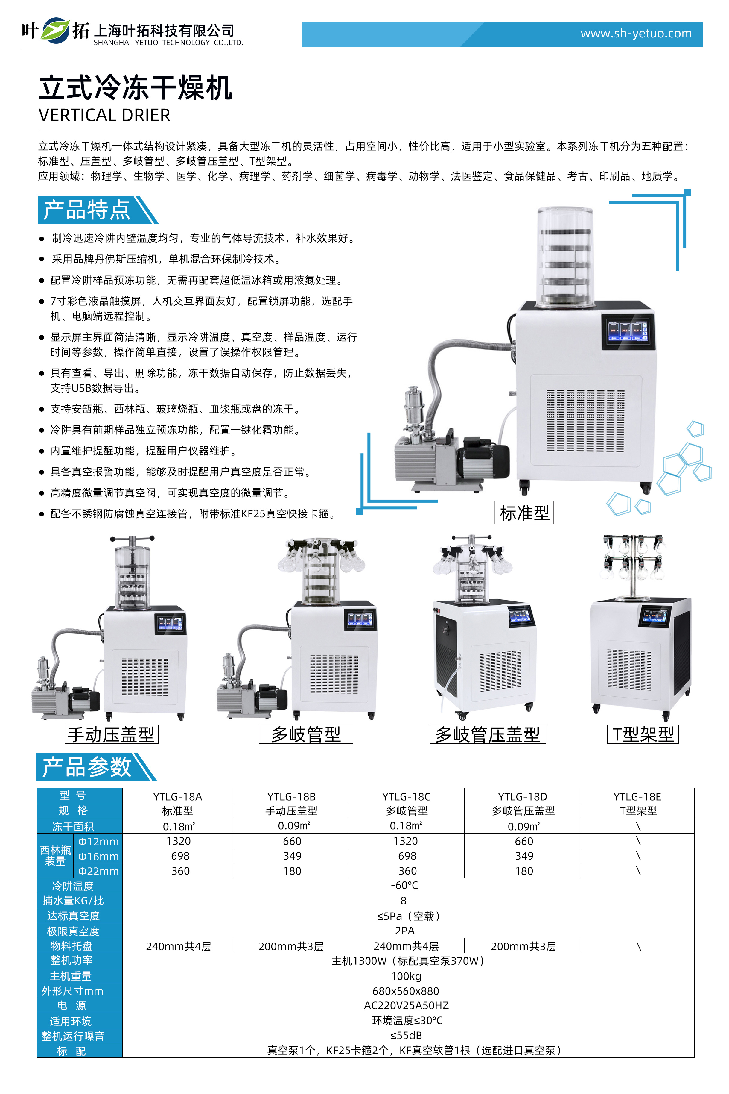 工作原理:立式冷冻干燥机18型相比12型号,冻干面积更大。一体式结构设计紧凑,性价比高,适用于小型实验室。本系列冻干机分为四种配置:标准型、压盖型、多岐管型、多岐管压盖型。